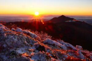 霧島連山最高峰 韓国岳の樹氷やえびの尻尾とご来光❗ 他、四位の山々などとの絶景です🎵 ①②ご来光 遠景は、高千穂峰や新燃岳 ③眼下に大浪池、遠くには桜島 ④⑤えびの尻尾と、絶景