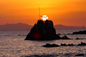 阿久根牛ノ浜景勝地に沈む夕陽❗ すみっ瀬の鳥居と重なり、絶景でした🎵 遠くには、甑島も鮮明に見えましたよ❗