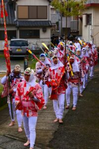 片浦のお伊勢講祭が2月11日、行われました❗ ニセ(青年)たちが女装し、狐や天狗のお面をつけ、木整の槍を振りながら街を練り歩く、無病息災を願う、珍しいお祭りです🎵